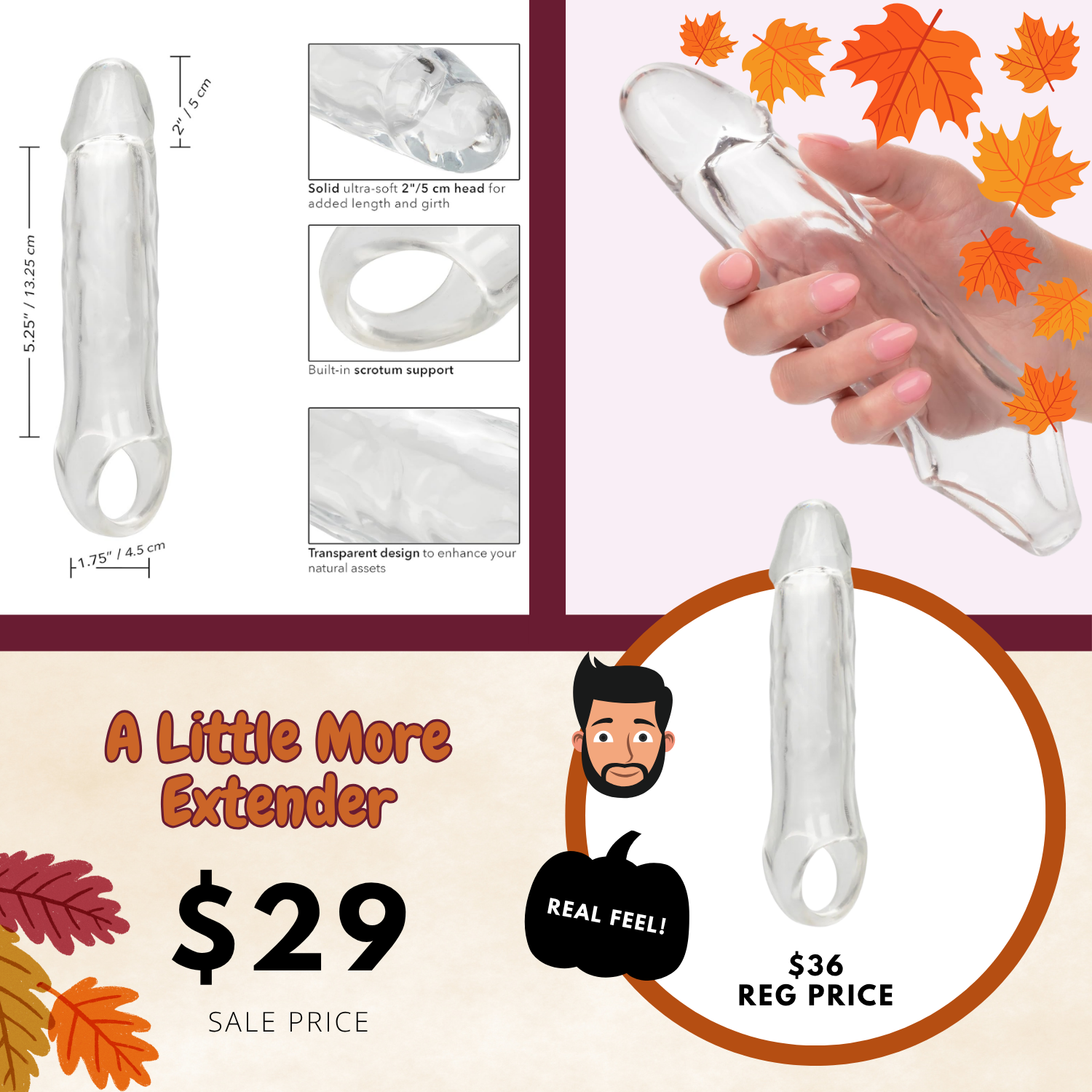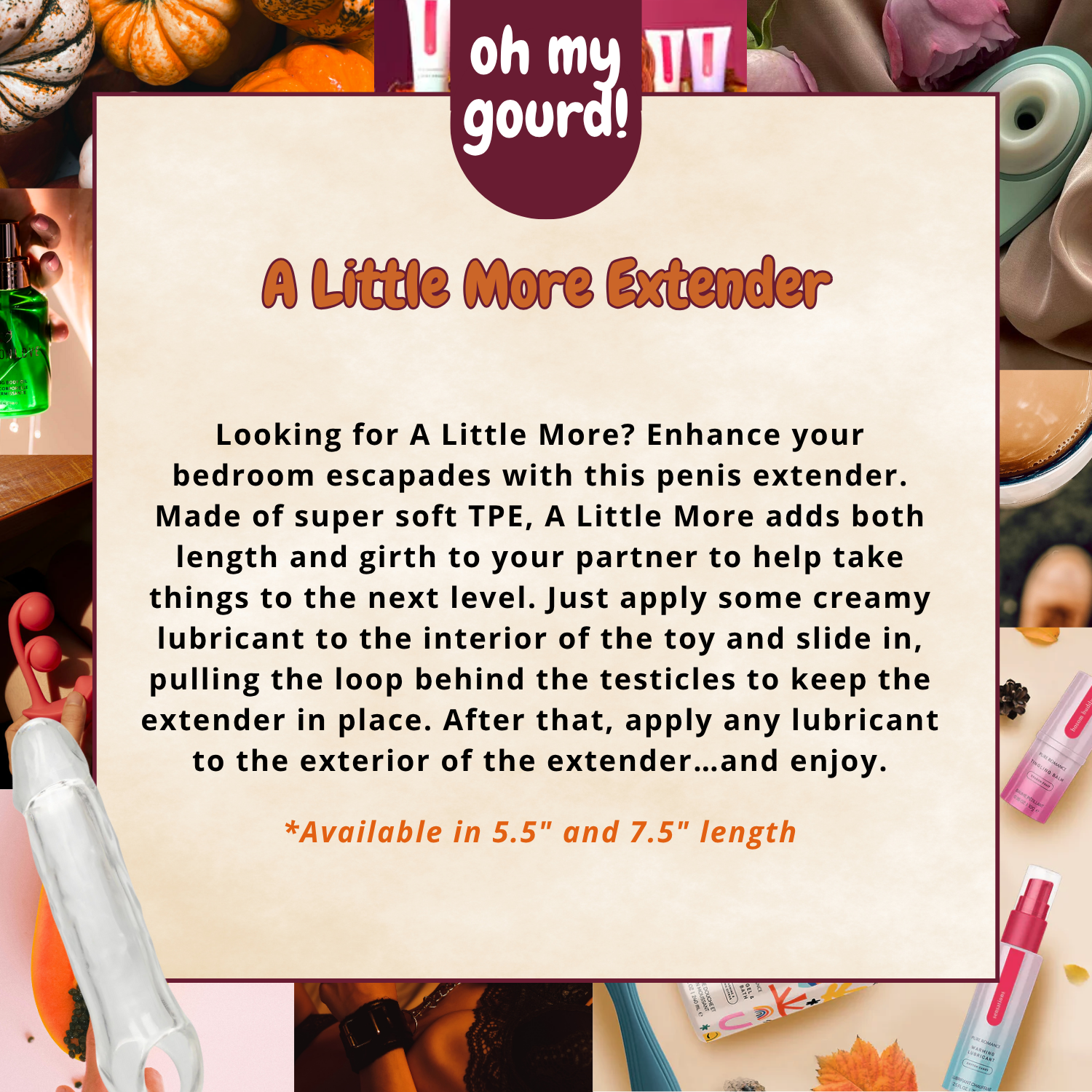 Looking for A Little More? Enhance your bedroom escapades with this penis extender. Made of super soft TPE, A Little More adds both length and girth to your partner to help take things to the next level. Just apply some creamy lubricant to the interior of the toy and slide in, pulling the loop behind the testicles to keep the extender in place. After that, apply any lubricant to the exterior of the extender…and enjoy.