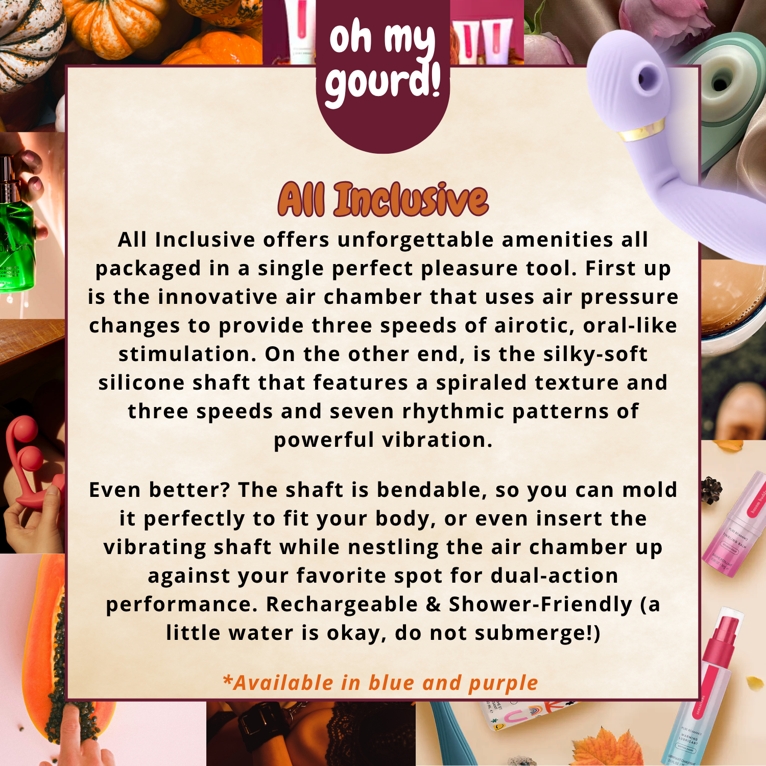 All Inclusive offers unforgettable amenities all packaged in a single perfect pleasure tool. First up is the innovative air chamber that uses air pressure changes to provide three speeds of airotic, oral-like stimulation. On the other end, is the silky-soft silicone shaft that features a spiraled texture and three speeds and seven rhythmic patterns of powerful vibration.