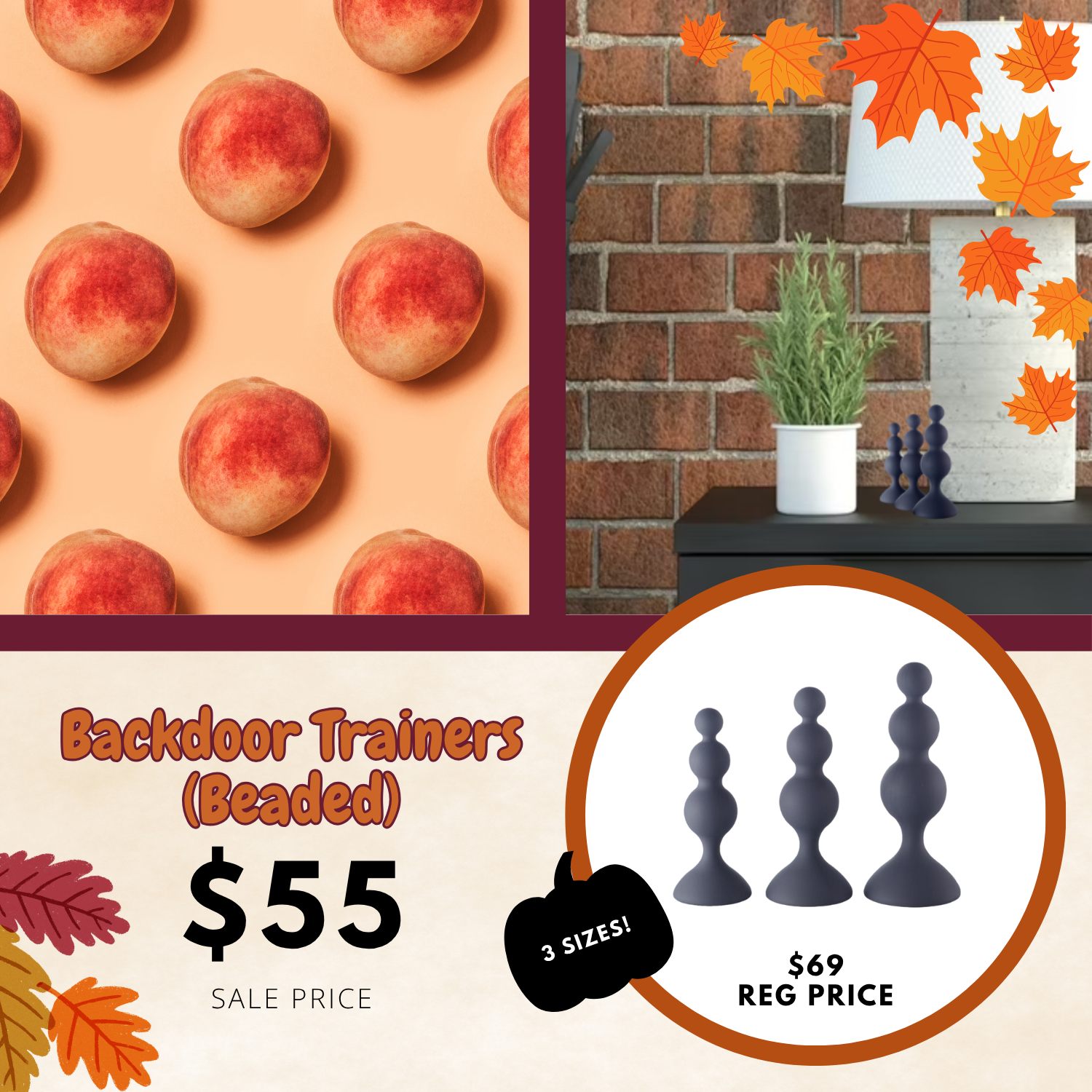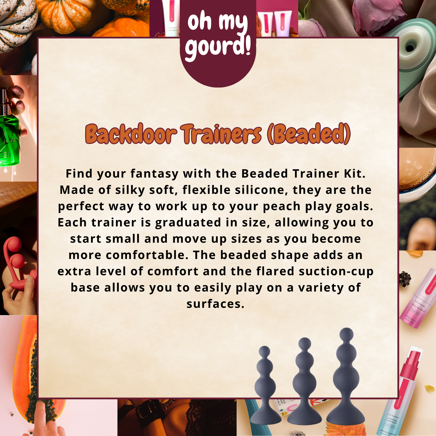 Find your fantasy with the Beaded Trainer Kit. Made of silky soft, flexible silicone, they are the perfect way to work up to your peach play goals. Each trainer is graduated in size, allowing you to start small and move up sizes as you become more comfortable. The beaded shape adds an extra level of comfort and the flared suction-cup base allows you to easily play on a variety of surfaces.
