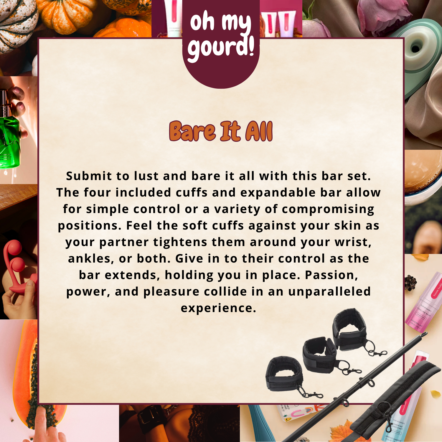 Submit to lust and bare it all with this bar set. The four included cuffs and expandable bar allow for simple control or a variety of compromising positions. Feel the soft cuffs against your skin as your partner tightens them around your wrist, ankles, or both. Give in to their control as the bar extends, holding you in place. Passion, power, and pleasure collide in an unparalleled experience.