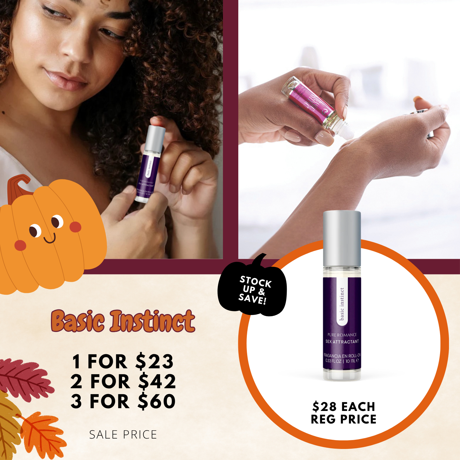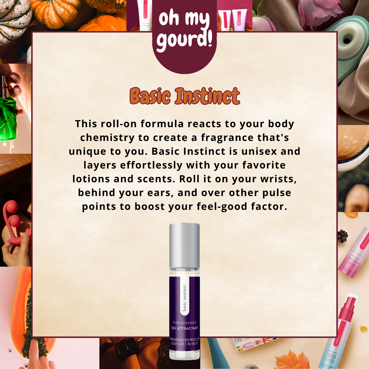 Attract all the attention you desire with Basic Instinct. This roll-on formula reacts to your body chemistry to create a fragrance that’s unique to you. Basic Instinct is unisex and layers effortlessly with your favorite lotions and scents. Roll it on your wrists, behind your ears, and over other pulse points to enhance your natural allure.