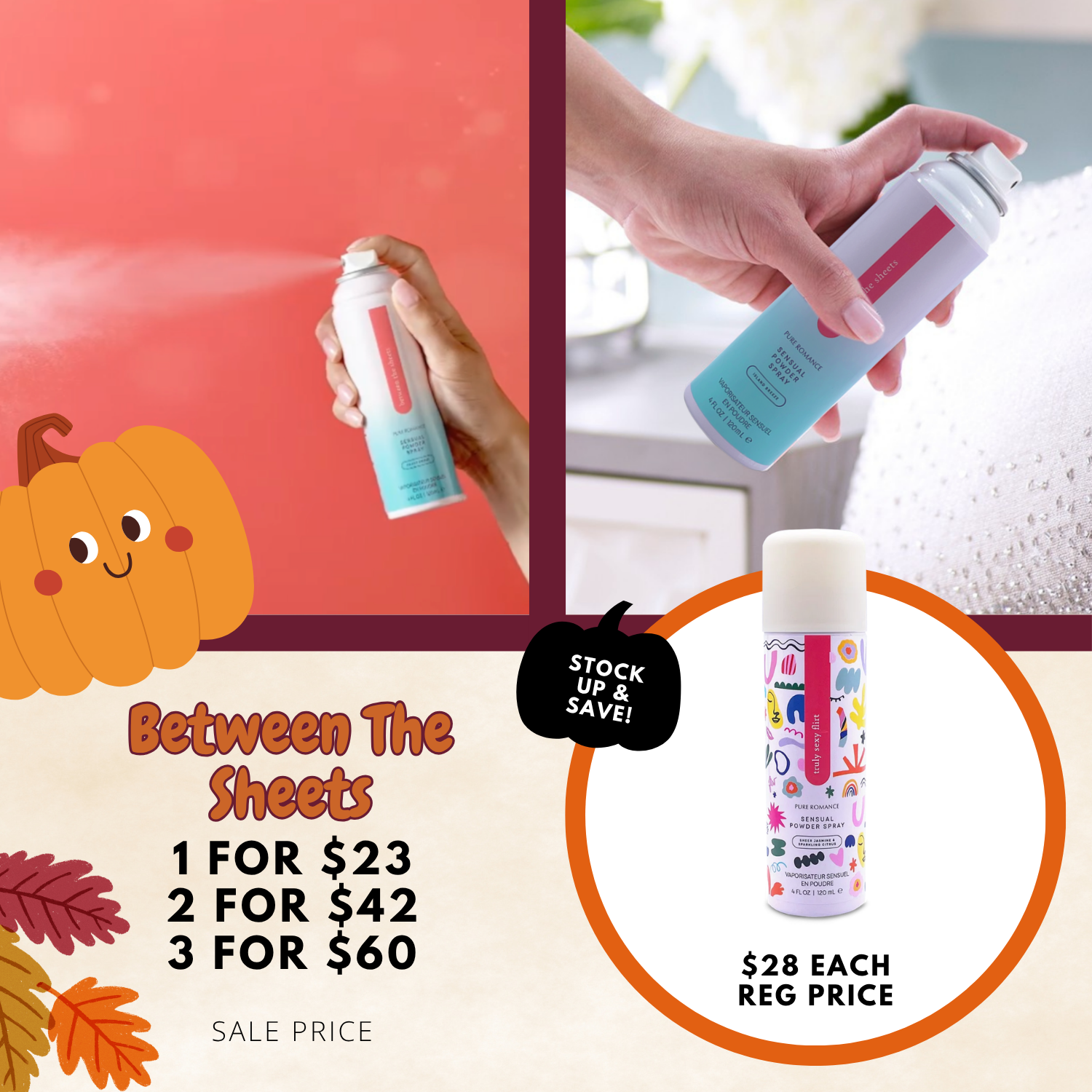 There's no denying that fresh is sexy. Between the Sheets is a powder-based linen spray that adds an alluring fragrance anywhere you spray it! After little fun in the bedroom, use a spritz or two to absorb moisture and make your sheets feel just like satin and put an end to the dreaded wet spot!