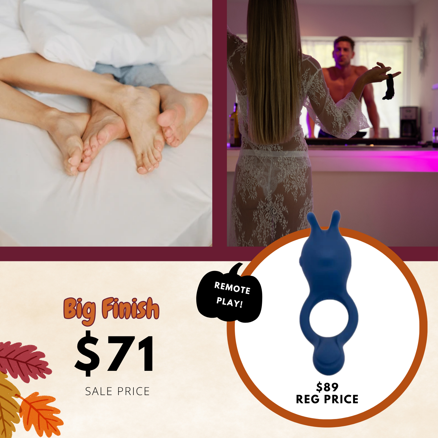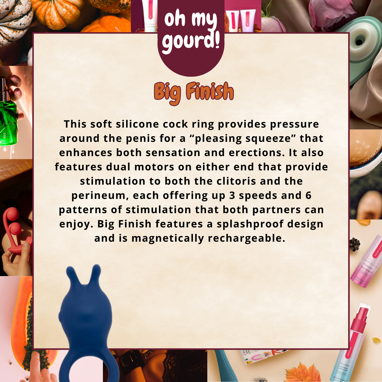 This soft silicone cock ring provides pressure around the penis for a “pleasing squeeze” that enhances both sensation and erections. It also features dual motors on either end that provide stimulation to both the clitoris and the perineum, each offering up 3 speeds and 6 patterns of stimulation that both partners can enjoy. Big Finish features a splashproof design and is magnetically rechargeable.