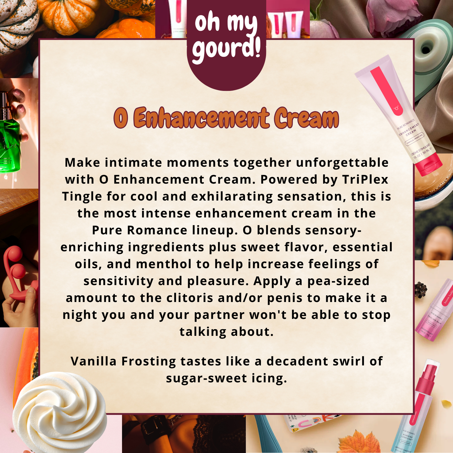 Make intimate moments together unforgettable with O Enhancement Cream. Powered by TriPlex Tingle for cool and exhilarating sensation, this is the most intense enhancement cream in the Pure Romance lineup. O blends sensory-enriching ingredients plus sweet flavor, essential oils, and menthol to help increase feelings of sensitivity and pleasure. Apply a pea-sized amount to the clitoris and/or penis to make it a night you and your partner won't be able to stop talking about.
