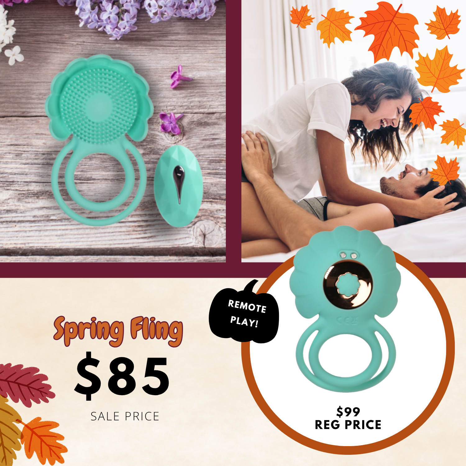 Let pleasure bloom with Spring Fling! A vibrating c-ring and remote set made for two. Slip one flexible silicone ring over the shaft and the other over the testicles to add pleasurable pressure to your partner’s experience, then angle the multi-textured surface towards your vulva.