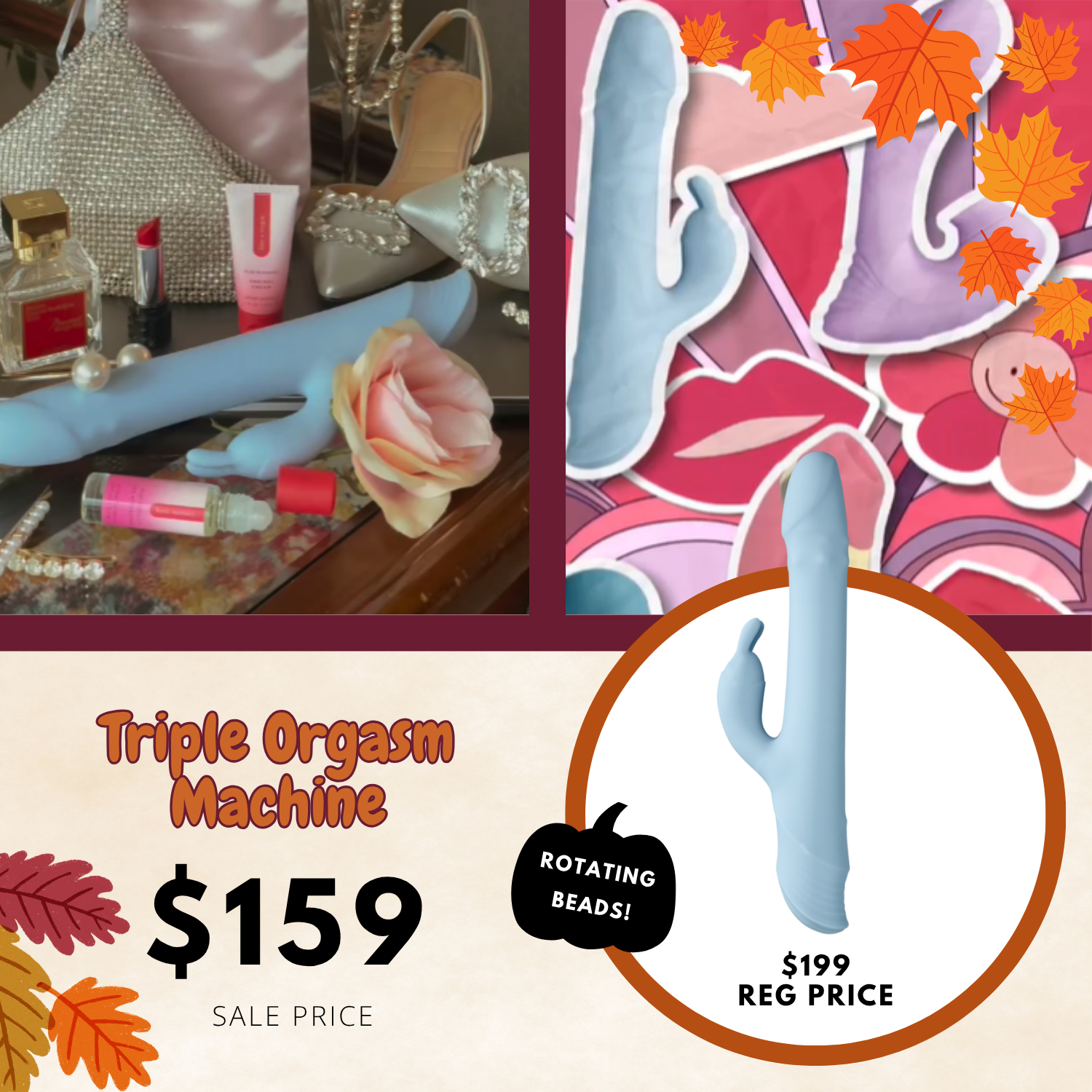 When it comes to powerful, mind-blowing pleasure, more is always more! Discover passion (times three!) with Triple Orgasm Machine, a 3-in-1 vibrator that redefines ecstasy with 3 speeds of thrusting, spinning shaft action and 7 speeds and pulsing patterns of clitoral vibration. As the shaft thrusts, the spinning beads inside tantalize your vaginal walls while the clitoral massager's rabbit ears tease your clitoris with feel-so-good vibrations.
