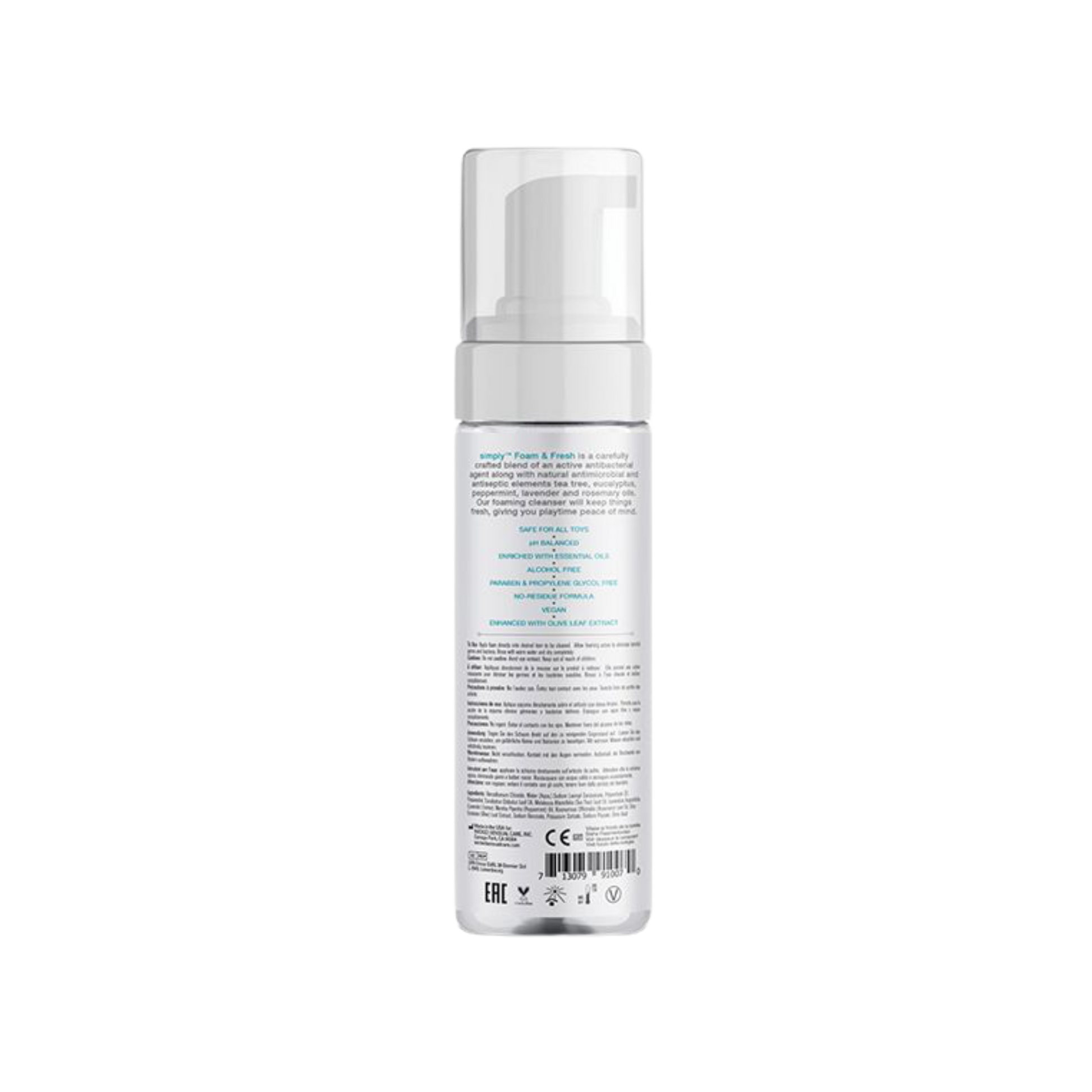 simply® Foam and Fresh adult toy cleaner with essential oils for keeping intimate toys squeaky clean. It is a carefully crafted blend of an active antibacterial agent along with natural antimicrobial and antiseptic elements tea tree, eucalyptus, peppermint, lavender and rosemary oils. Our foaming cleanser will keep things fresh, giving you playtime peace of mind.